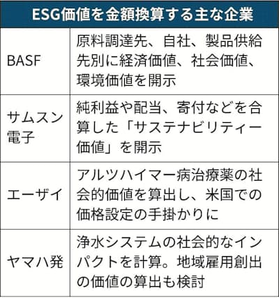 企業が生み出すESG(環境・社会・企業統治)価値を金額に換算して開示する取り組みが広がっている。ヤマハ発動機は途上国での浄水システム設置事業で約1500万ドル(約22億円)の社会的価値を創出したと開示した。非財務情報に基づく価値を「見える化」することで投資家の再評価を促し、マネーの呼び込みにつなげる。