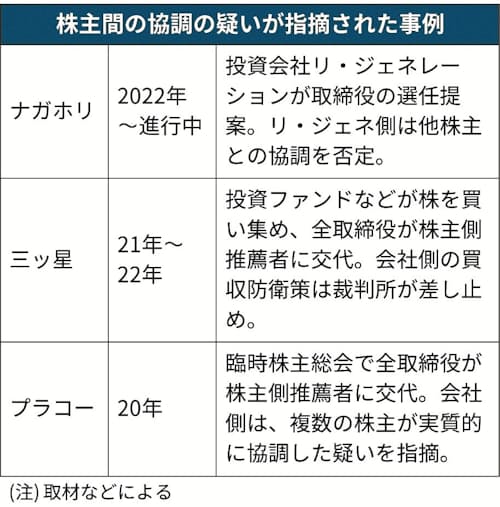 金融商品取引法では企業の5%以上の株式を取得した投資家は、議決権を共同で行使する合意があるなどの協調関係も含めて財務局に5営業日以内に届け出なければならない。だが買収防衛に詳しい伊藤広樹弁護士は「提出が半年以上遅れる例もある」と指摘。「有価証券報告書の虚偽記載などと比べ、軽い違反だとみられてしまいがち。(法令による)抑止効果が働いていない」とみる。